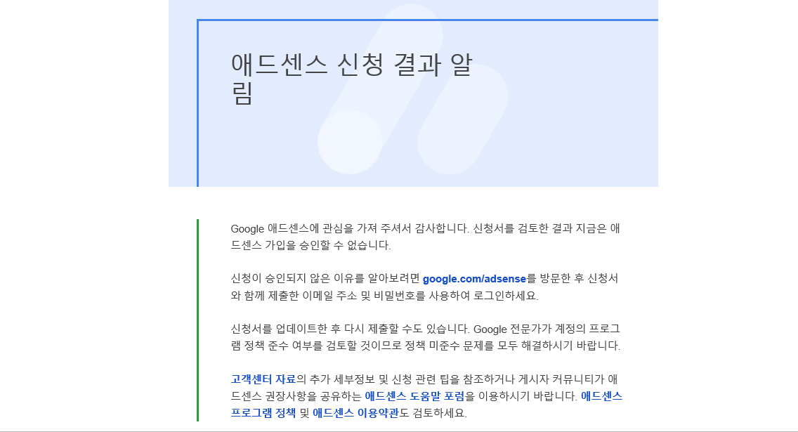 기쁜 내용이 아니라.. 구글 애드센스를 한 달 동안 기각당한 내용이네요