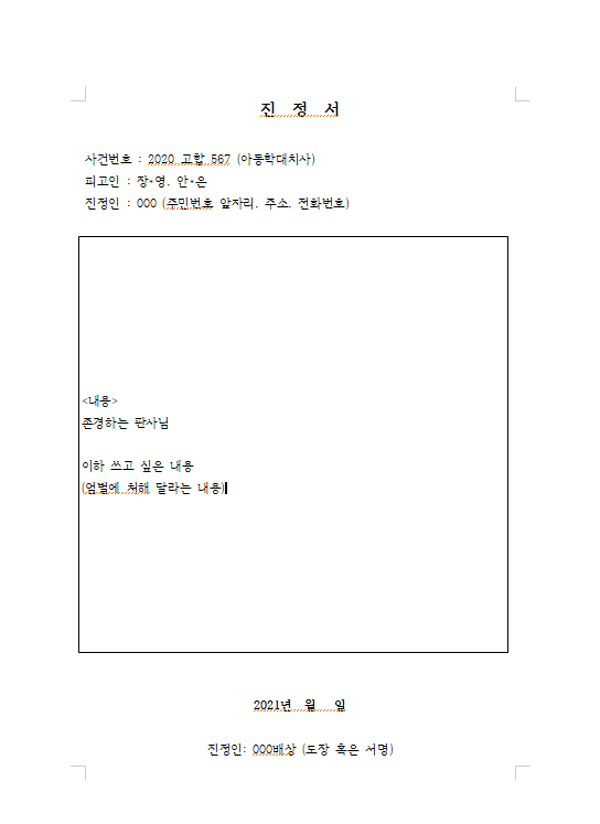 사건번호, 피고인 이름, 진정인 이름, 내용, 날짜, 도장 싸인, 받는 사람